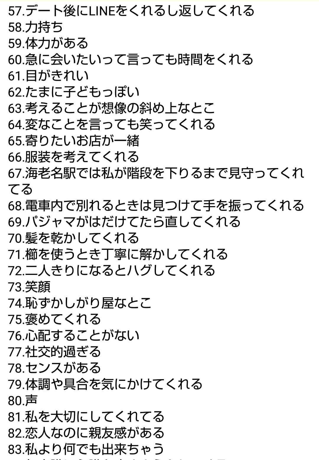 1素直なところ 嫌なの?欲しいの?と聞くと、 やだ!とか欲しい!って言ってくれる 2可愛い これは愛おしいを手短に伝える手段でありながらそのままの意味 3優しい 星5レベルで優しいのに たぶん自分ではそれをあんまり自覚してない そこがまた、良き 4面白い 私が好きな笑いのセカルピスウォーターが好き q99 97 好きな曲がいっぱいある q100 98 ゲームが得意 q101 99 何げにドラマ見てる q102 100!!!好きな人を彼氏にするための作戦あるある 付き合う前の初デートはどこに行きたい?何をしたい? 付き合うのは3回目のデートが多い? hが始まりそうな時あるある 男性は毛の処理をした方がいい?